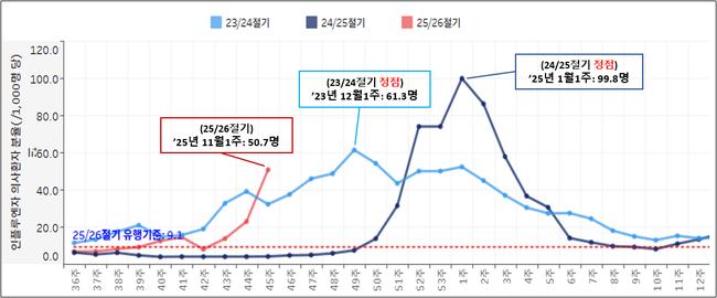 절기별 인플루엔자 발생 현황(23/24절기, 24/25절기, 25/26절기)