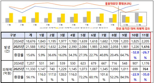 • 10~11월 발생 건수 26.7%↓, 피해액 35.0%↓… 전년 대비 뚜렷한 하락
