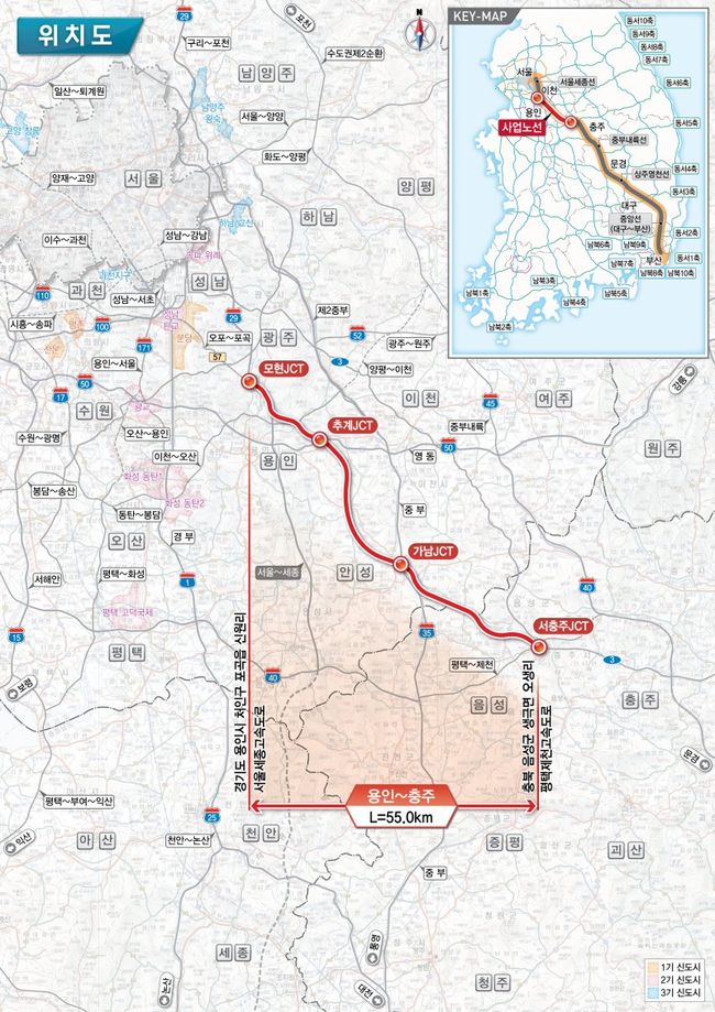 아울러 중부고속도로(남이천IC~일죽IC), 중부내륙고속도로(여주JCT~충주IC), 영동고속도로(양지IC~덕평IC) 구간 등 수도권과 충청을 잇는 주요 축의 교통정체 해소에도 도움이 될 전망이다.