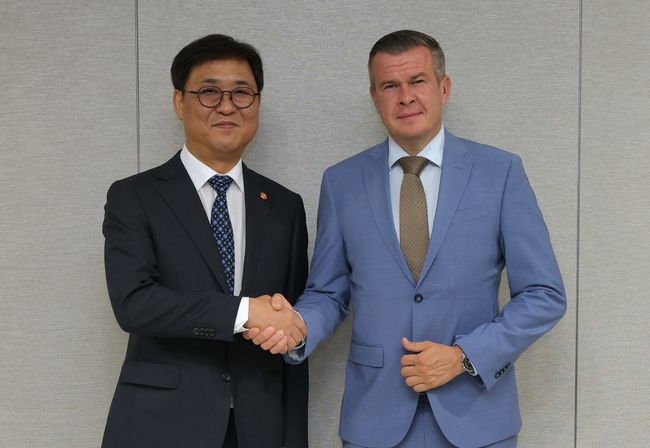 최휘영 문화체육관광부 장관이 25일 국회에서 위톨드 반카 세계도핑방지기구(WADA) 회장과 면담을 마치고 기념촬영을 하고 있다.