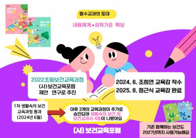 이 ‘초등 보건과목(학자시)’ 도입은 지난 2024년 6월 ‘생활속의 보건’ 교육과정을 처음 심의해 통과시킨지 약 1년 만의 일이다. 이후 보건 교육과정의 추가 신청을 받아 2025년 5월부터 보건 교과서(인정도서) 4종에 대한 심사가 진행돼 지난 8월 26일, 승인 공문이 시행됐다.