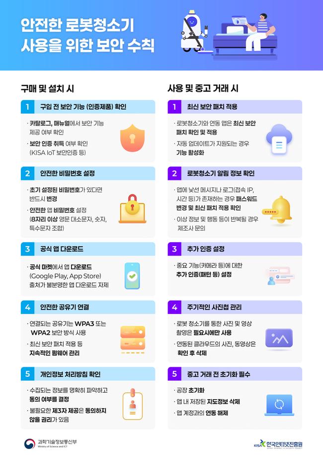 과학기술정보통신부가 한국인터넷진흥원(KISA), 한국소비자원과 함께 진행한 로봇청소기 보안 실태조사 결과 일부 제품에서 개인정보 유출 우려가 있는 취약점이 발견돼 개선 조치가 이뤄졌으며, IoT보안인증을 받은 제품이 상대적으로 보안성이 높은 것으로 나타났다.